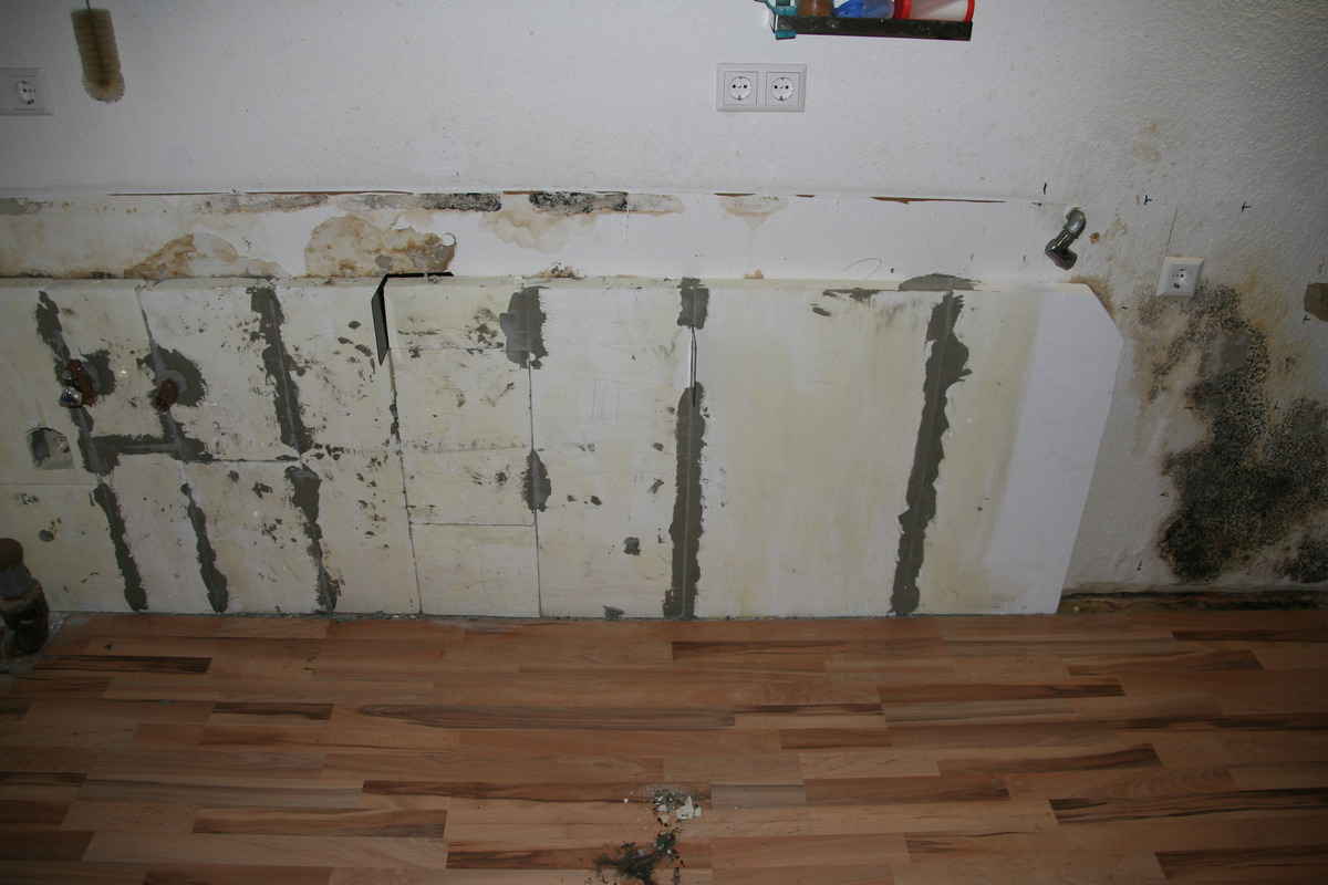 Dies wurde dadurch erreicht, dass Herr W. von der Firma B. Service GmbH in unserer Küche eine Überprüfung mit einer Wärmebildkamera durchgeführt hat. Zu diesem Zweck wurde im Badezimmer das warme Wasser laufen gelassen. Dabei hat sich heraus gestellt, dass der Wasserablauf des linken Waschbeckens im Badezimmer undicht war und das daraus abfließende Wasser nahezu vollständig in die Wand lief. Zeitgleich mit dem laufenden Wasser konnte dies auf der Wärmebildkamera beobachtet werden. Es wurde dann vereinbart, dass der schadhafte verschimmelte Putz vollständig entfernt werden müsste um die Trocknung zu begünstigen. Außerdem musste natürlich das schadhafte Abflussrohr repariert werden. Dazu wollte Herr P. Herrn Sp. beauftragen. Dieser kam auch noch am gleichen Tag. Dabei wurde vereinbart, dass der Abfluss durch die Wand vom Badezimmer in die Küche verlegt werden könnte um damit defekten Abfluss still zu legen. Wir meinten dann, dass es vielleicht sinnvoll wäre den Abfluss des zweiten Waschbeckens und der Waschmaschine sicherheitshalber gleich mit zu verlegen um zukünftigen Schäden vorzubeugen. Die Verlegung des Abflussrohres war aber nur möglich, weil unsere Einbauküche auf dieser Seite 10 cm von der Wand entfernt montiert ist und wir eine überbreite Küchenarbeitsplatte mit 70 cm Tiefe haben. Dem stimmte Herr Sp. zu und so wurde vereinbart, dass zunächst das linke Waschbecken nicht verwendet werden dürfte, damit nicht noch mehr Wasser in die Wand laufen würde. Wir hatten zu diesem Zeitpunkt also nunmehr nur ein einziges Waschbecken, das wir außerdem, dass dies unser einziges Waschbecken in der ganzen Wohnung war auch noch zum Spülen von Geschirr benutzen mussten. Herr P. wollte ein Trocknungsgerät besorgen um die durchfeuchtete Wand zu trocknen und Herr Sp. sollte am nächsten Tag kommen um die Arbeiten am Abwasserrohr durchzuführen. Herr P. hat dann ein Trocknungsgerät bei der Firma Baustoffunion besorgt das noch am gleichen Tag um 12:00 Uhr in Betrieb genommen wurde. Zudem kam Herr P. und hat den Putz an der Wand selbst bis auf das Mauerwerk entfernt.